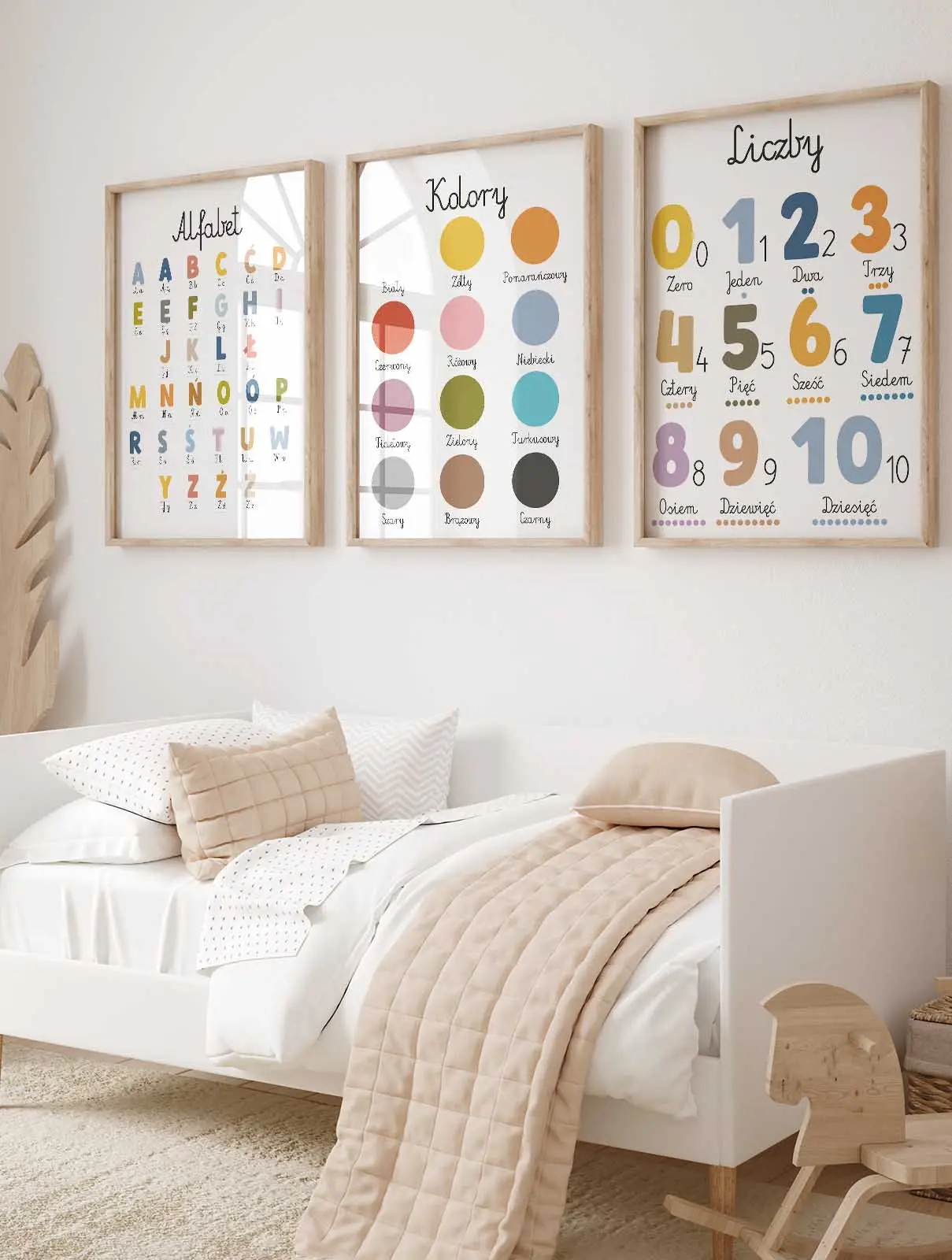 Plakat edukacyjny Montessori z alfabetem (Wzór 2) – kolorowa pomoc dydaktyczna do nauki liter w pokoju dziecka, przedszkolu lub szkole.