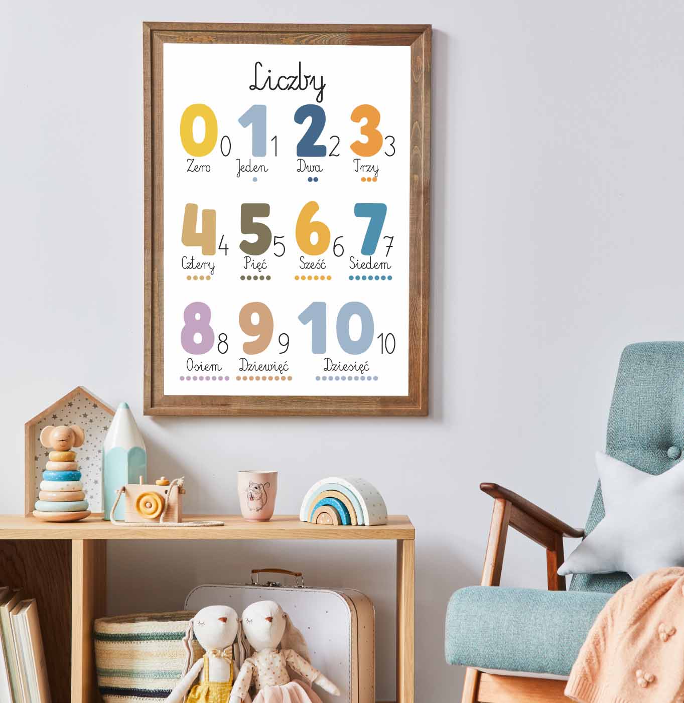 Delikatny plakat Montessori z liczbami 1–10 pomaga dzieciom w nauce liczenia i pięknie ozdabia pokój. Idealny do stylu boho, vintage i edukacji domowej.