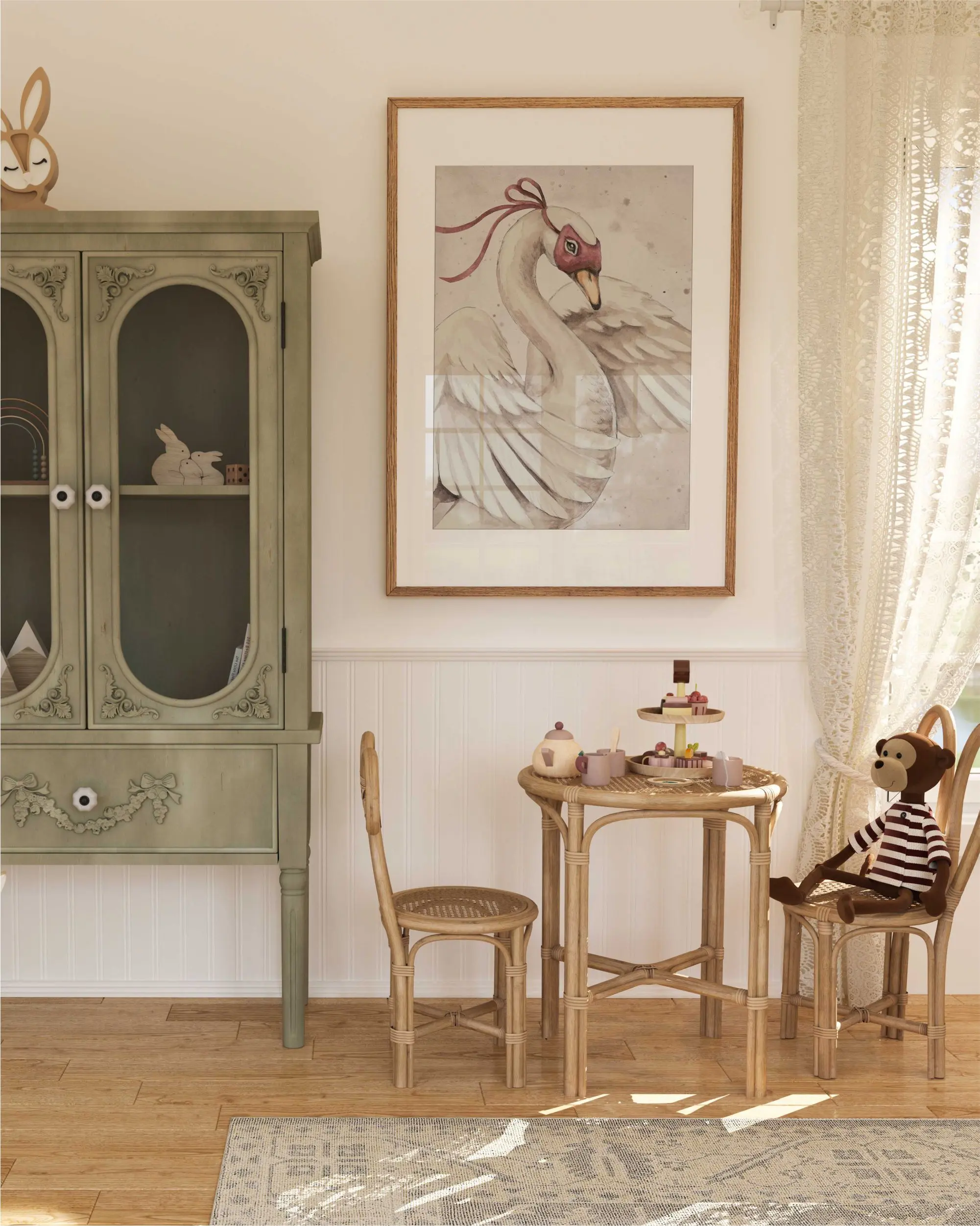 Ten piękny plakat „Łabędź w Masce – Swan Vintage” to opowieść o elegancji i delikatności, która przenosi w świat spokoju i klasycznego piękna. Subtelne odcienie beżu i kości słoniowej oraz miękkie pociągnięcia pędzla tworzą wyjątkową, retro dekorację ścienną. Wydłużona szyja, białe pióra i gracja łabędzia oczarują każdego dnia, wprowadzając do wnętrza nutę bajkowego klimatu. Idealny plakat do pokoju dziecka lub eleganckiej przestrzeni w stylu vintage.