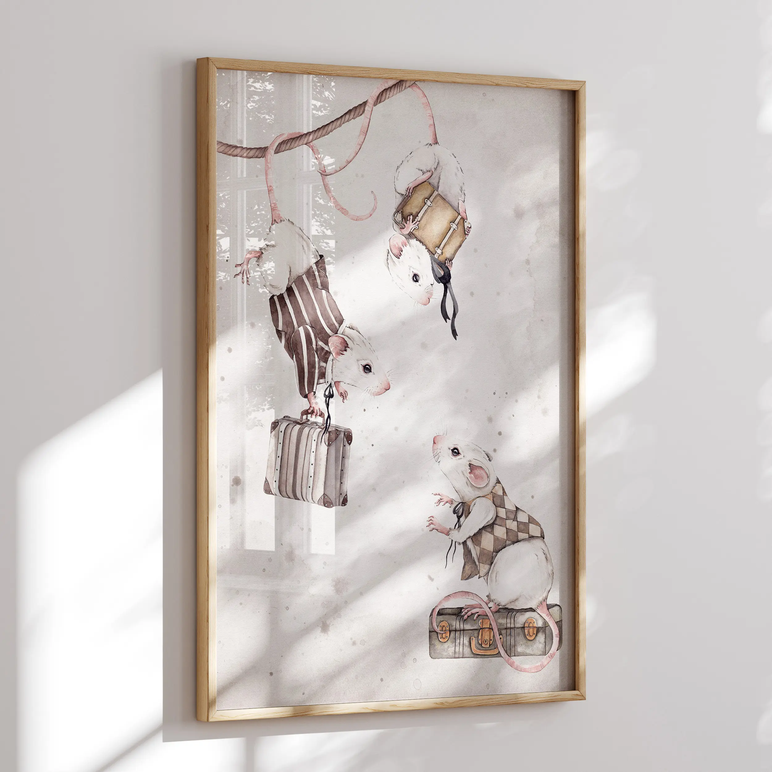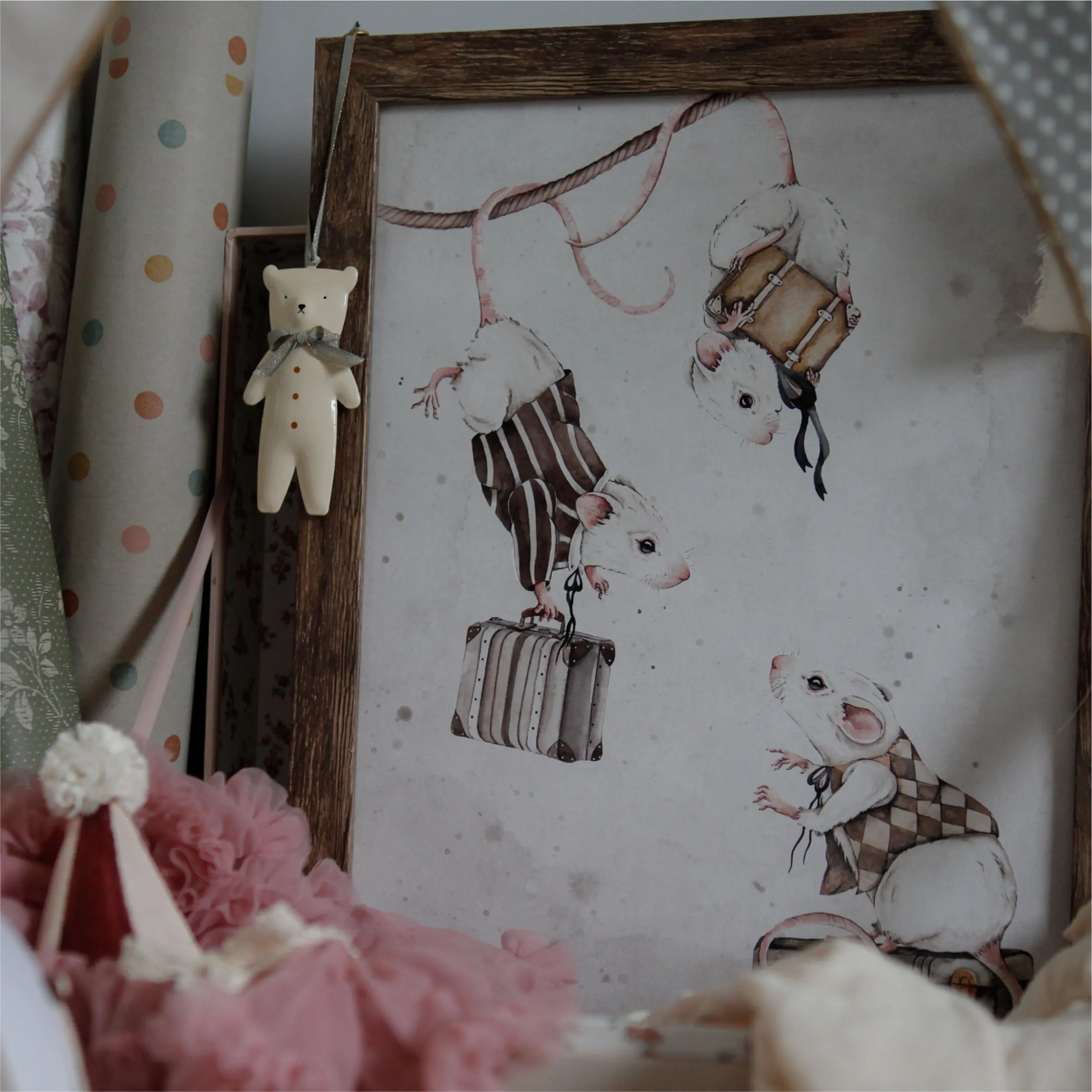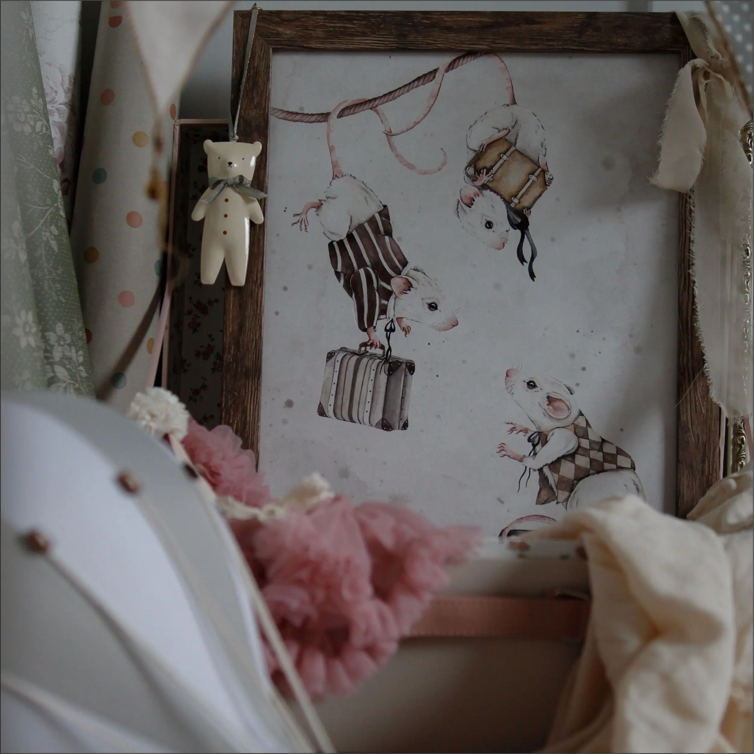 Plakat z Myszami Podróżniczkami z kolekcji Vintage Travel to ilustracja malowana na wyłączność dla Małej Pracowni. Pełna uroku, idealna do pokoju dziecka w stylu retro, boho i leśnym.