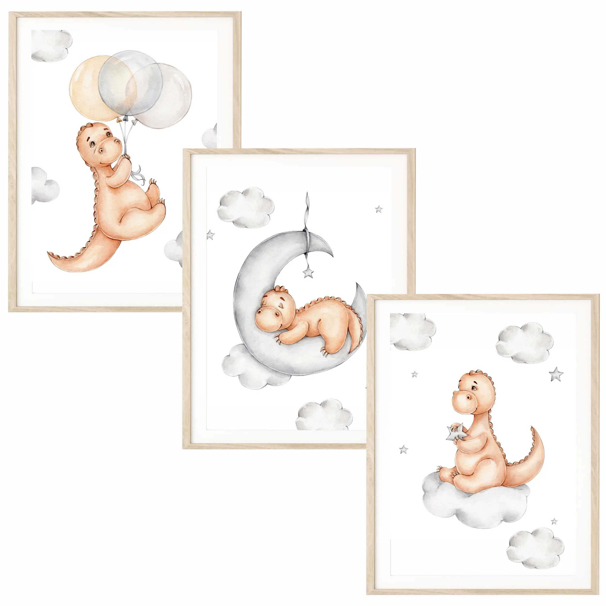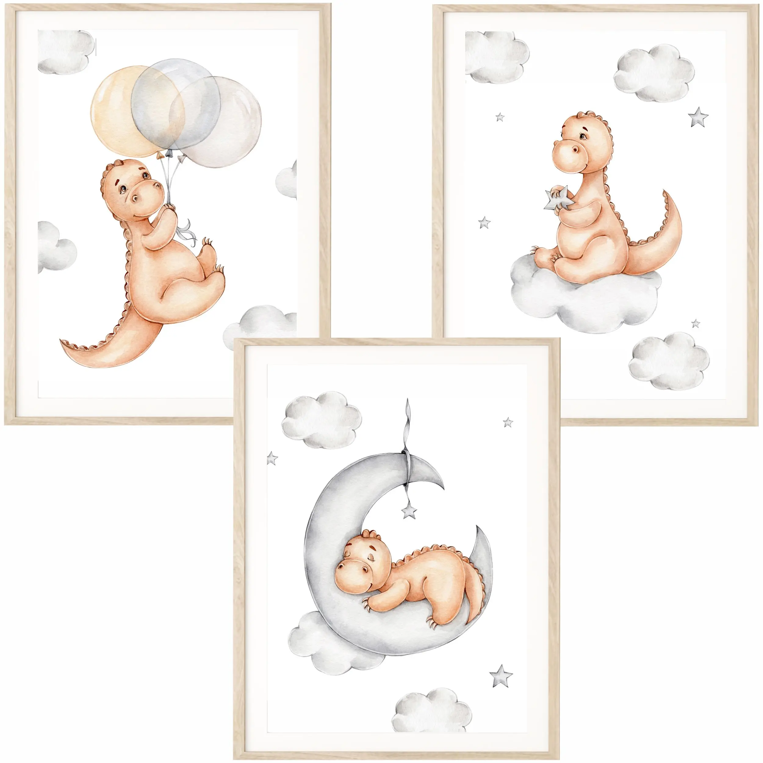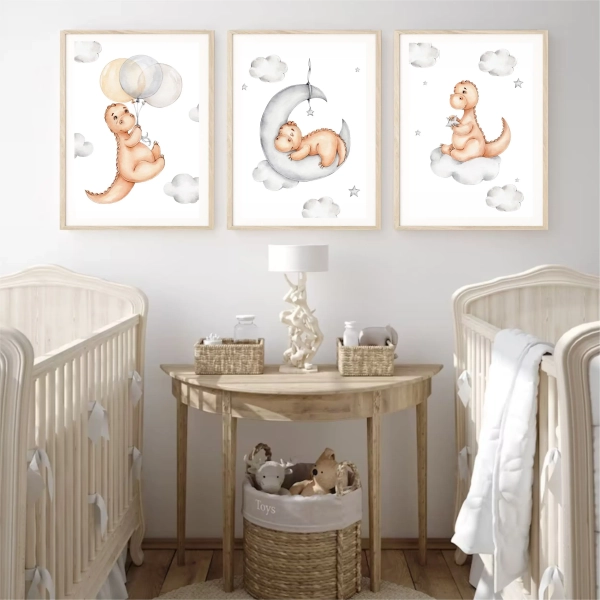 Zestaw 3 plakatów "Dinozaury na Chmurkach" to wspaniała dekoracja ścienna do pokoju dziecka.
