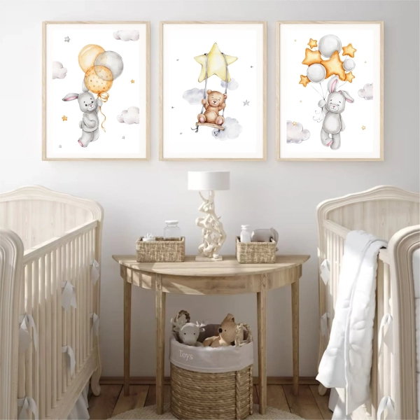 Stwórz wyjątkową przestrzeń w pokoju dziecka z zestawem plakatów "Misie i Zajączki z Balonami".