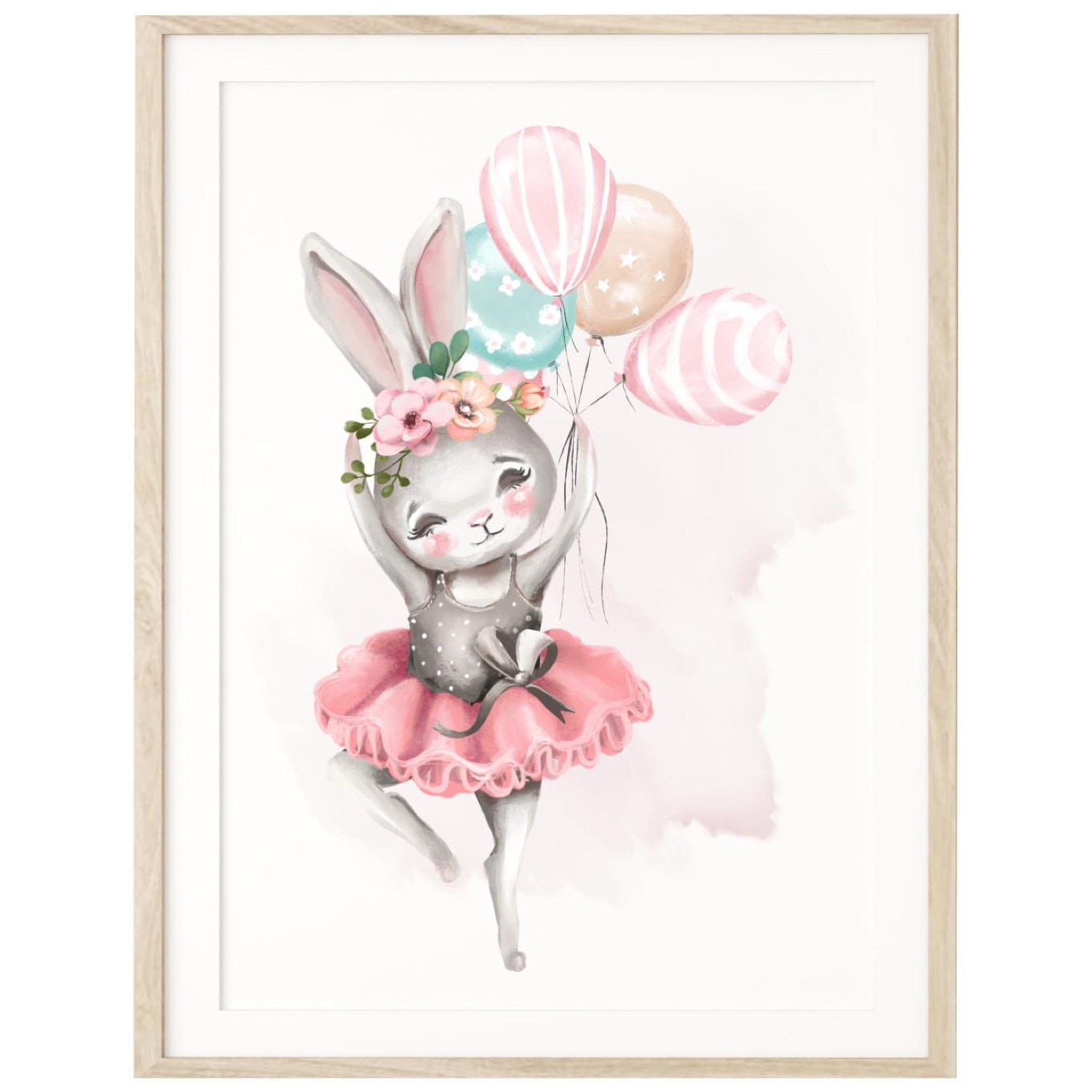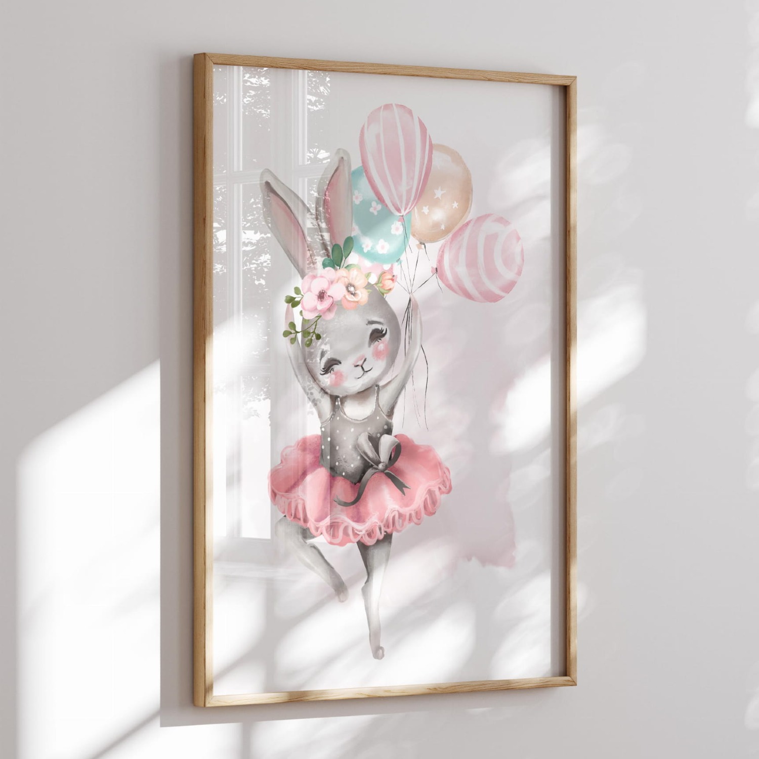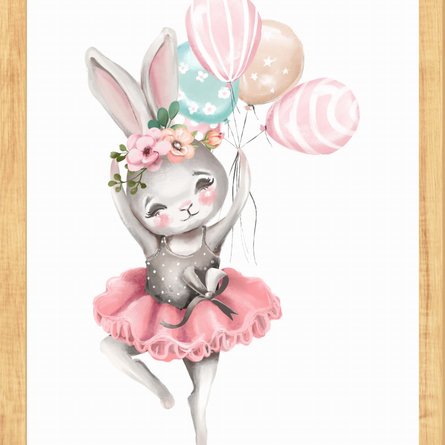 Plakat z uroczym króliczkiem w baletowej spódniczce i pastelowymi balonami. Idealna dekoracja na ścianę do pokoju dziewczynki – lekka, subtelna i pełna wdzięku.