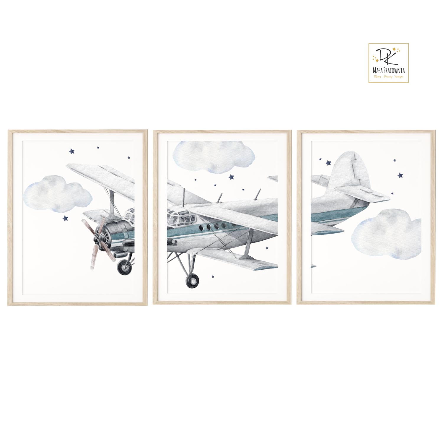 Tryptyk Nr.4 z serii retro przedstawia samoloty i balony na tle jasnego nieba. Trzy plakaty tworzą spójną dekorację do pokoju chłopca. Idealne do wnętrz w stylu vintage i skandynawskim.