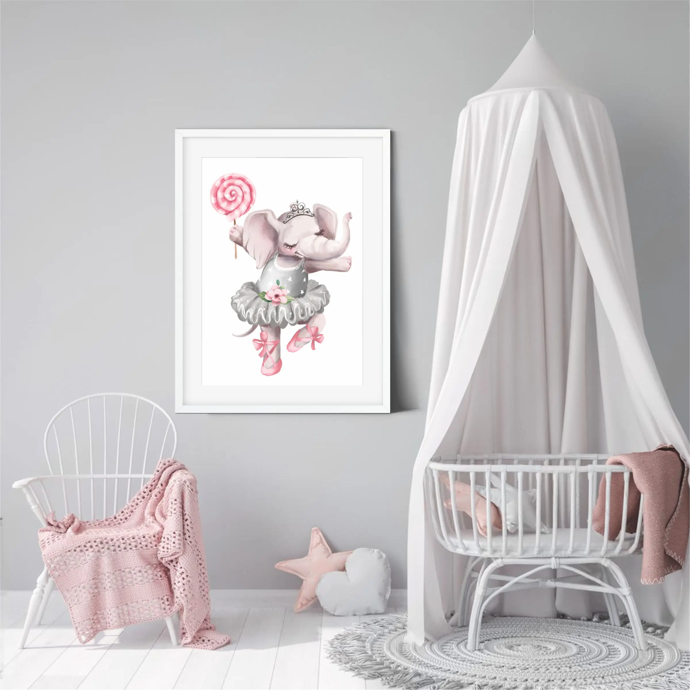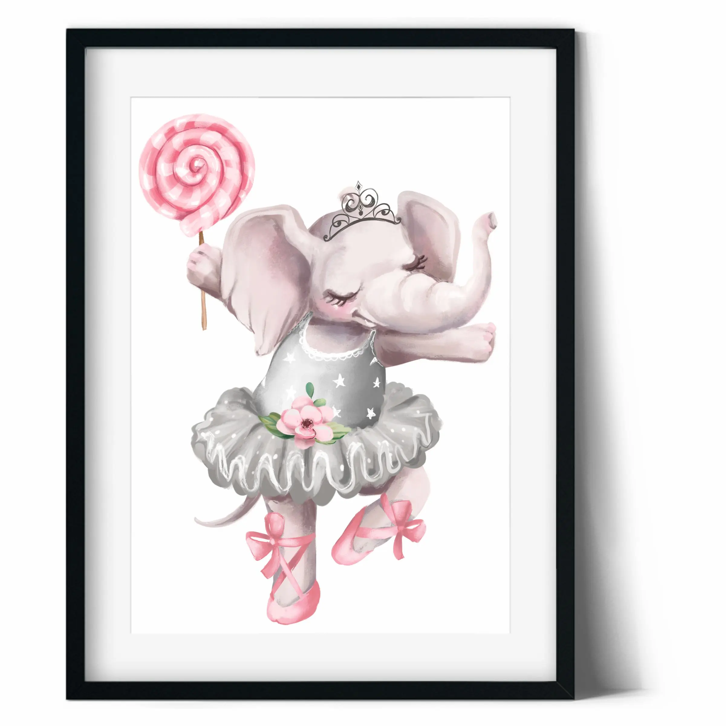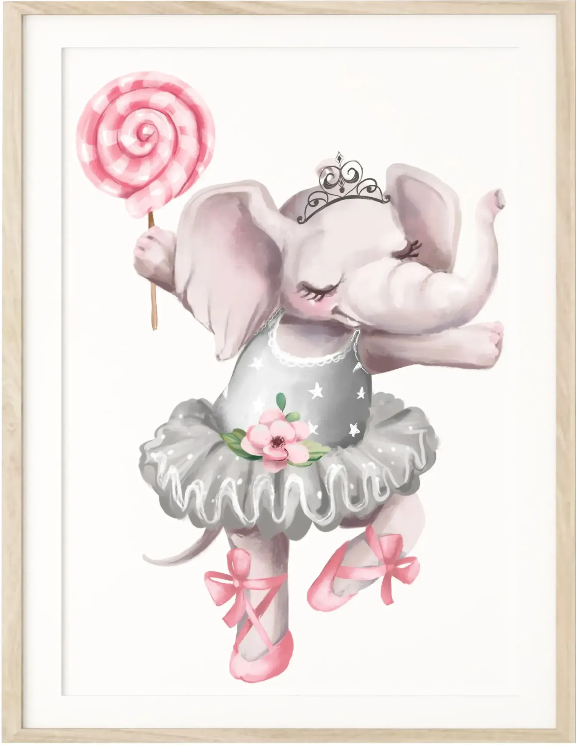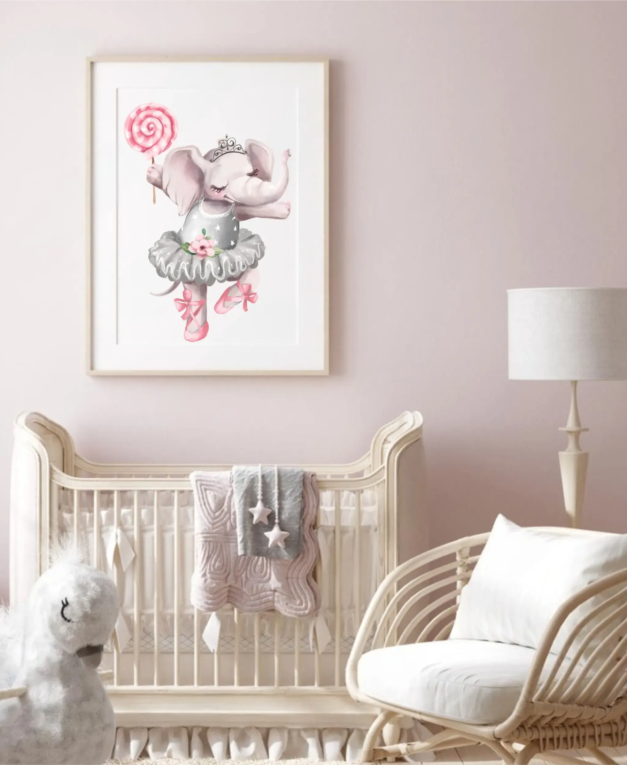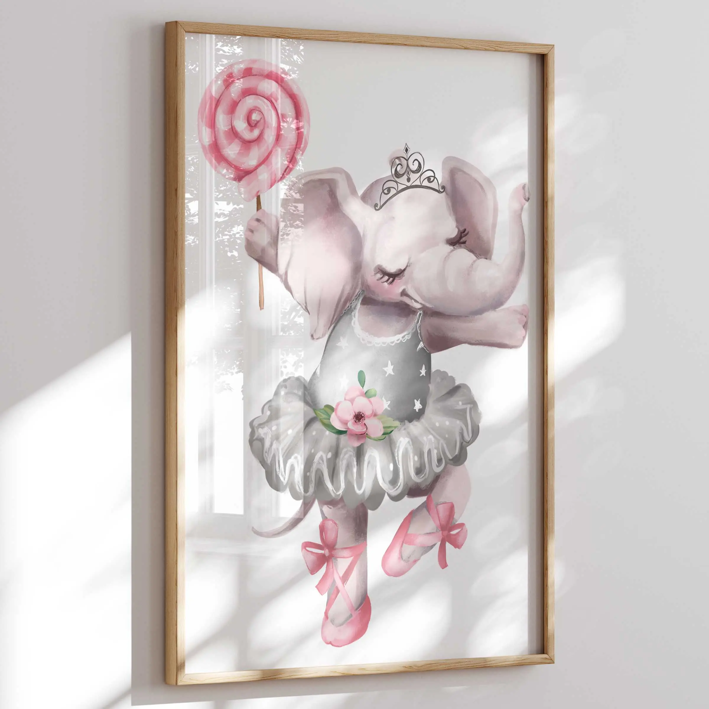 Plakat z uroczym słonikiem baletnicą i pastelowym lizakiem. Delikatny, bajkowy motyw, który ociepla wnętrze pokoju dziewczynki.