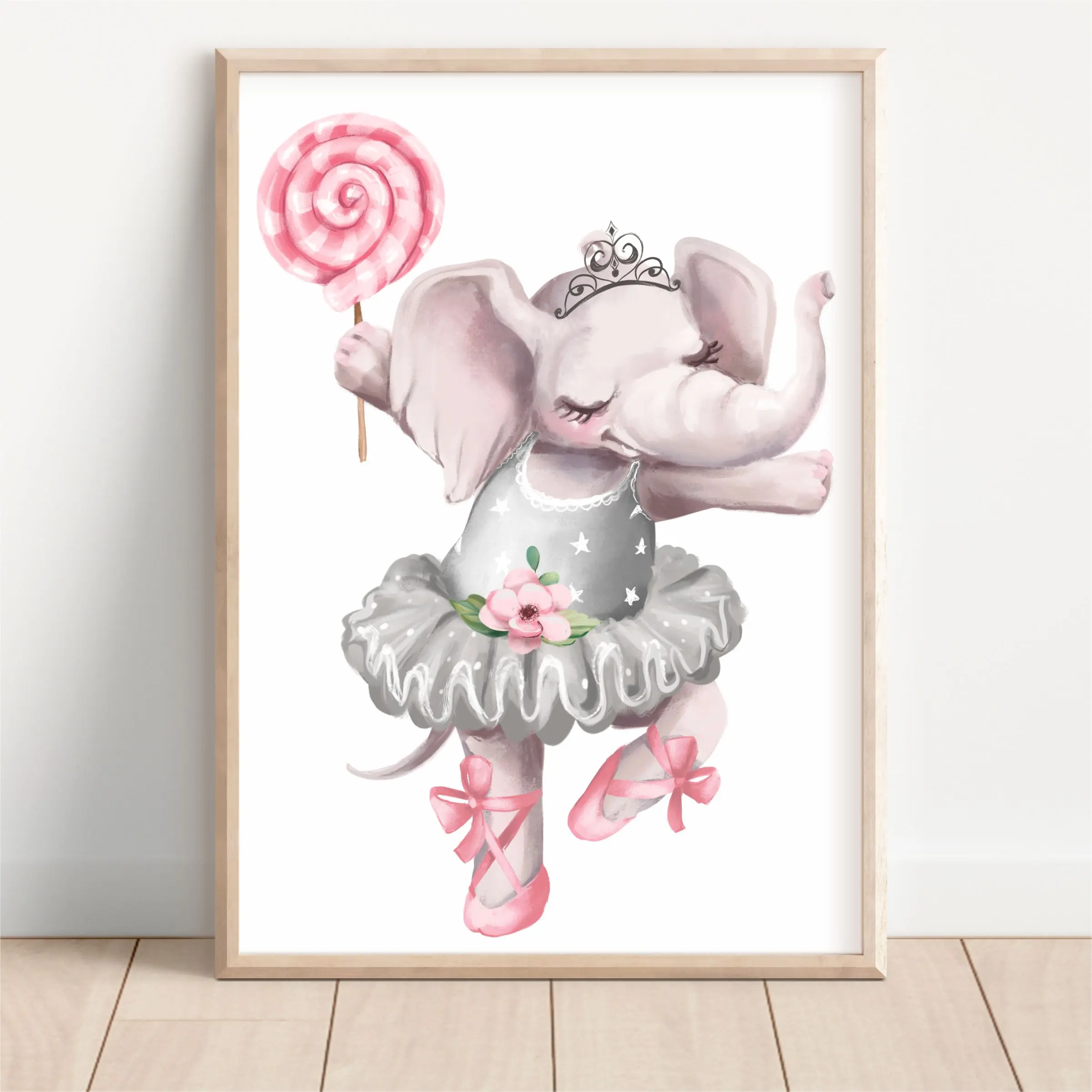 Uroczy plakat przedstawiający słonika baletnicę trzymającego pastelowy lizak. To dekoracja ścienna, która wnosi do pokoju dziewczynki radość, delikatność i bajkowy klimat. Motyw słonika w baletowej spódniczce, z tiarą i różowymi akcentami, doskonale pasuje do aranżacji w stylu skandynawskim, boho lub klasycznym.