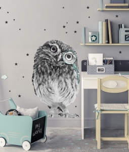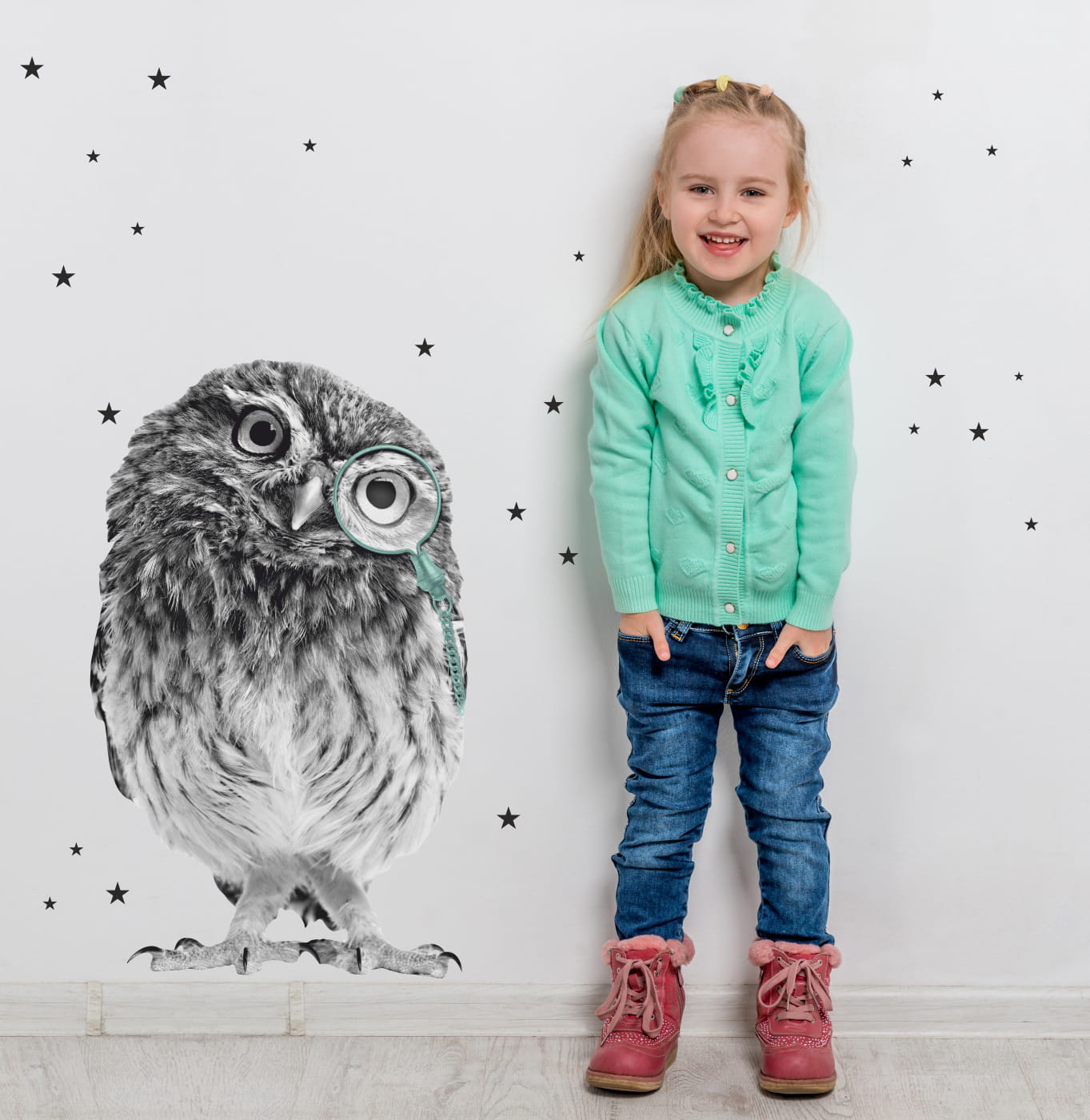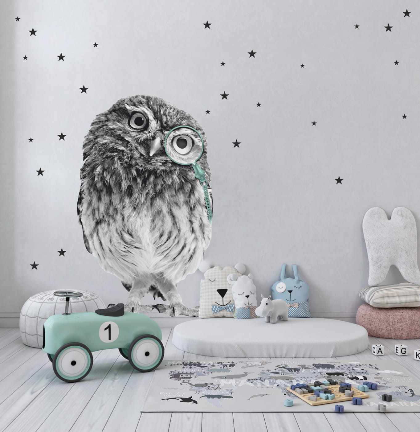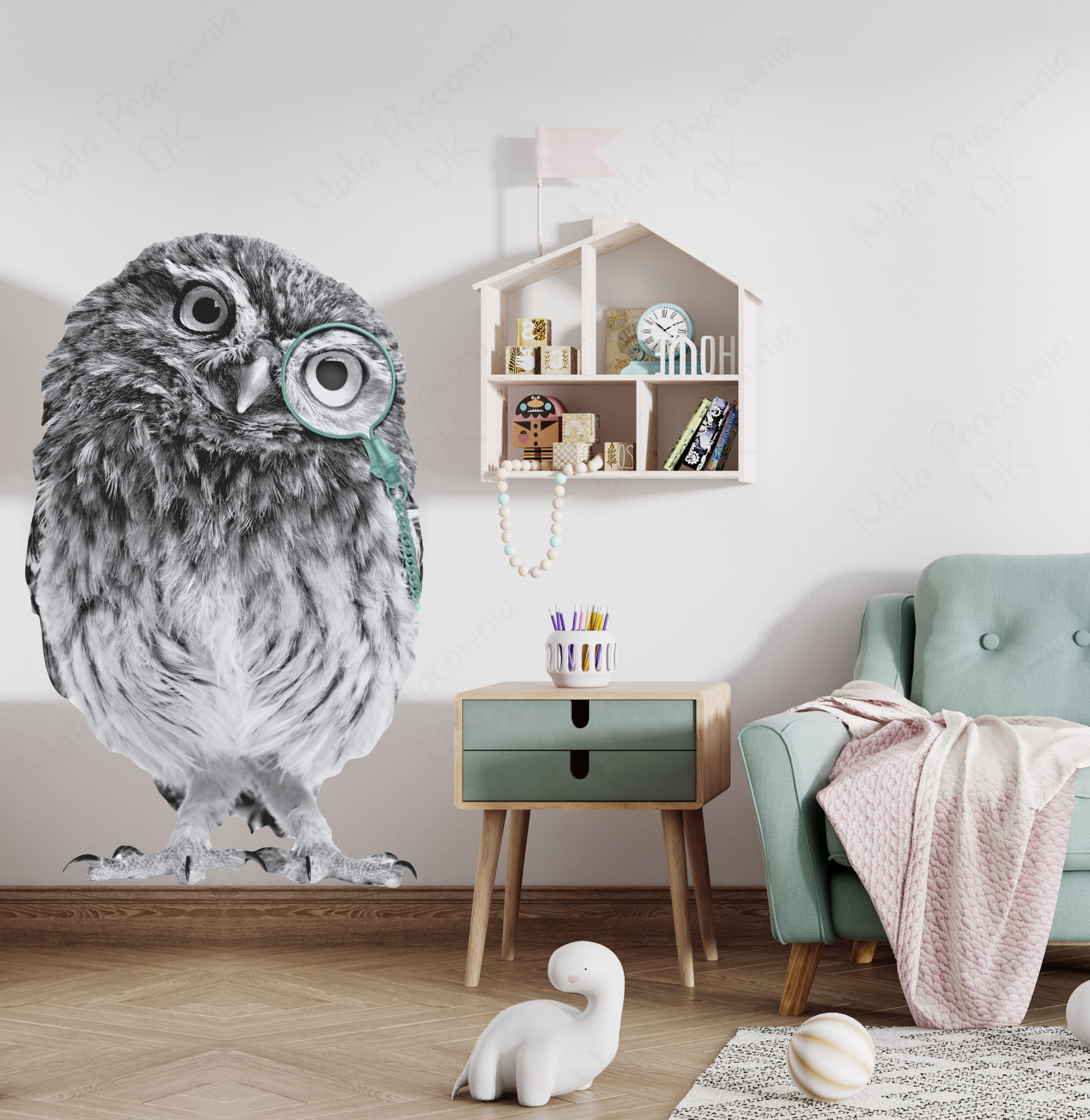 Naklejka na ścianę dla dzieci Sowa w miętowym monoklu wprowadzi do pokoju elegancki, lekki akcent i subtelny klimat retro.