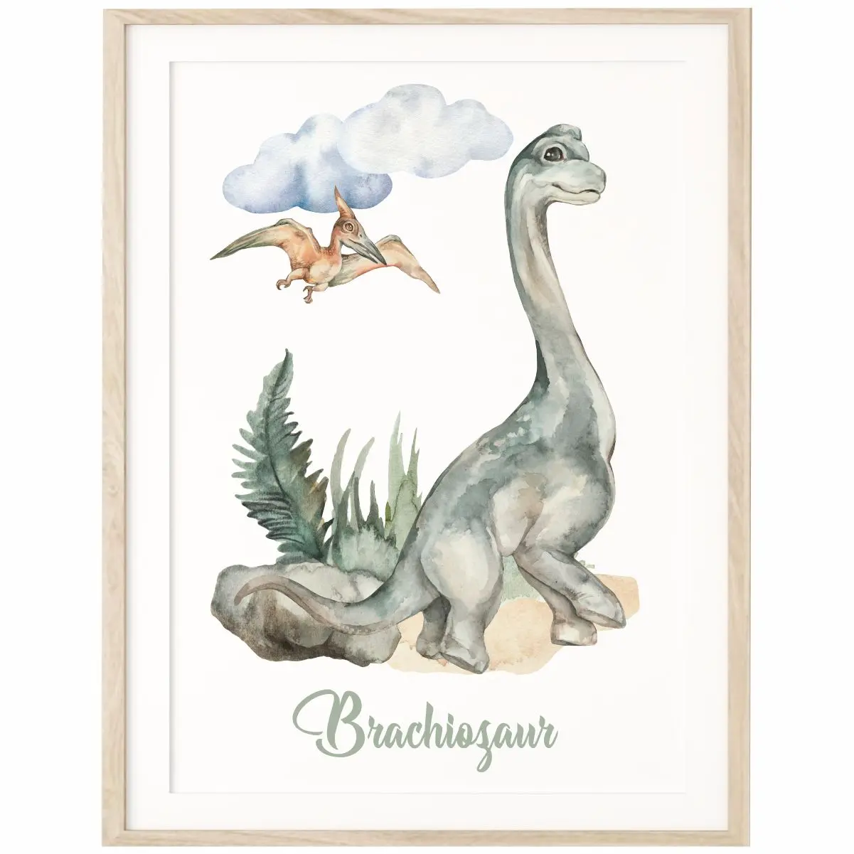 Plakat z łagodnym Brachiozaurem – delikatna dekoracja ścienna do pokoju dziecka. Doskonały wybór dla miłośników dinozaurów i przyrody.