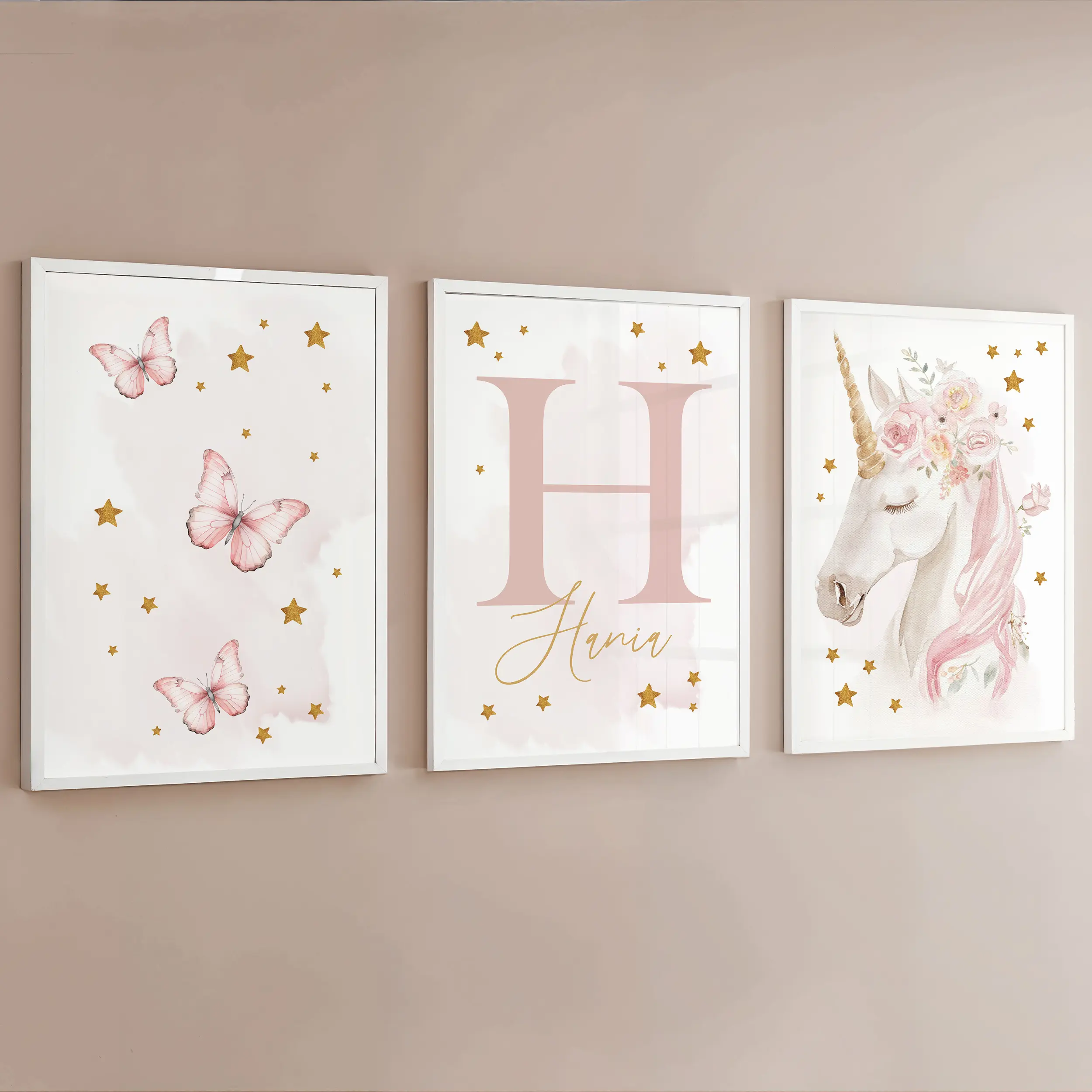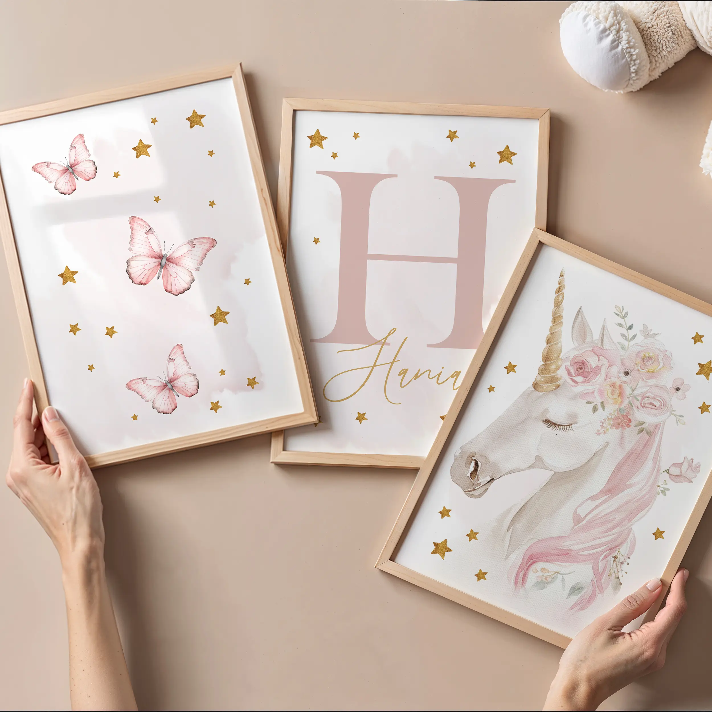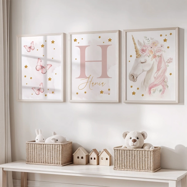 Zestaw 3 plakatów Jednorożec motyle – Zestaw 1 to wyjątkowa kolekcja dekoracji do pokoju dziewczynki. Bajkowy jednorożec, delikatne motyle oraz plakat z literą i imieniem dziecka tworzą razem spójną całość, która pięknie dopełnia dziecięcą przestrzeń.