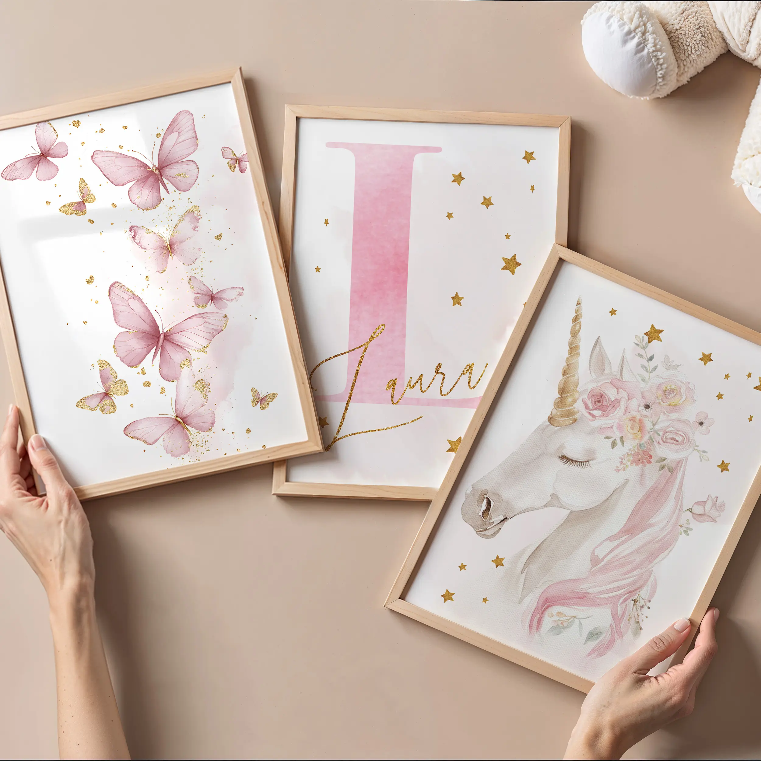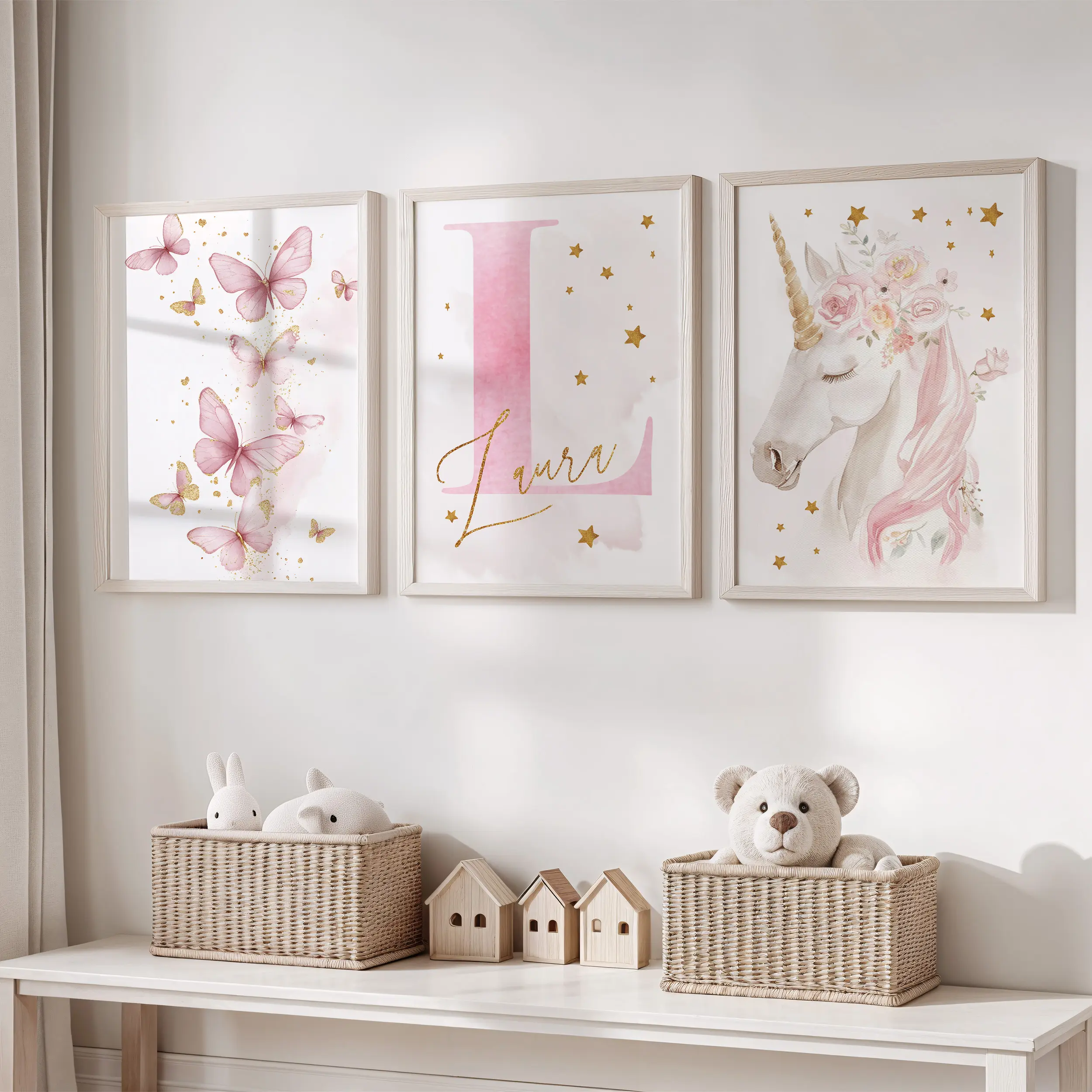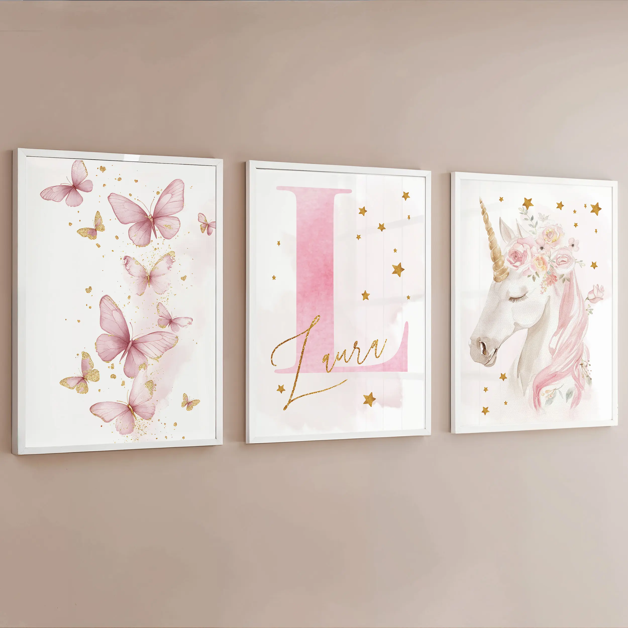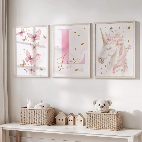 Zestaw 3 plakatów Jednorożec motyle – Zestaw 4 łączy bajkowego jednorożca, pastelowe motyle oraz personalizowany inicjał z imieniem dziecka. Całość tworzy spójną dekorację, która przyciąga wzrok, ale nie przytłacza wnętrza.