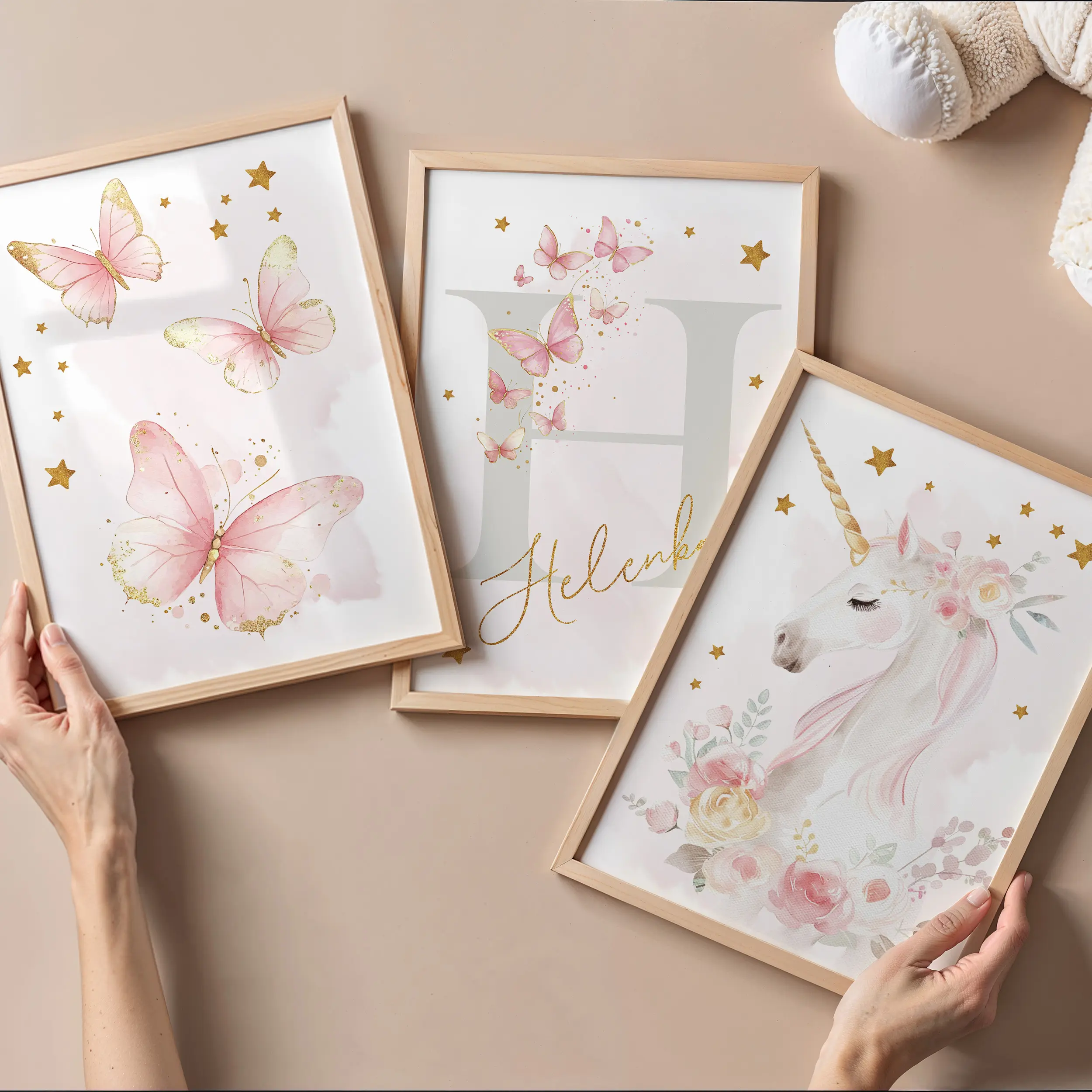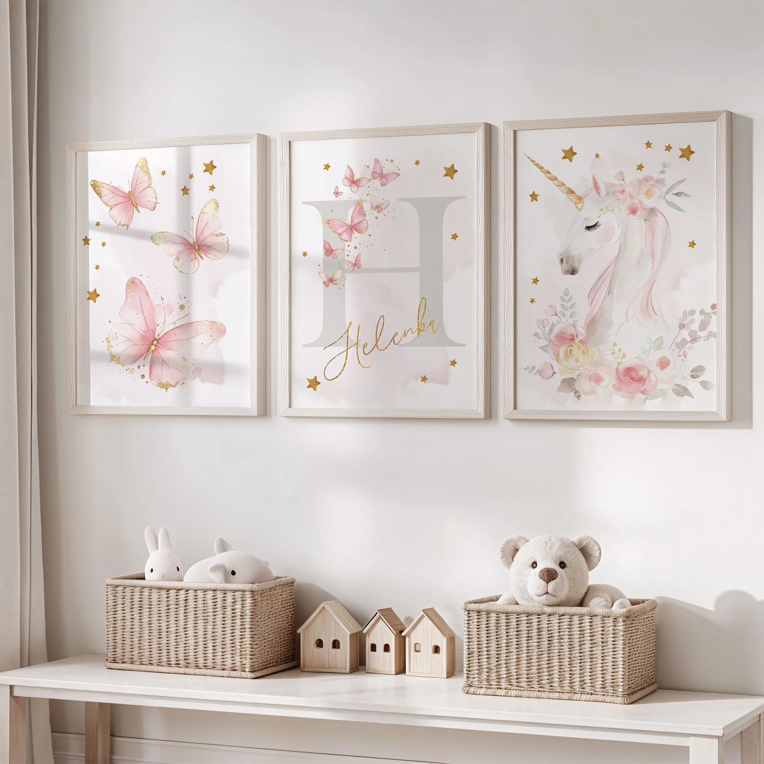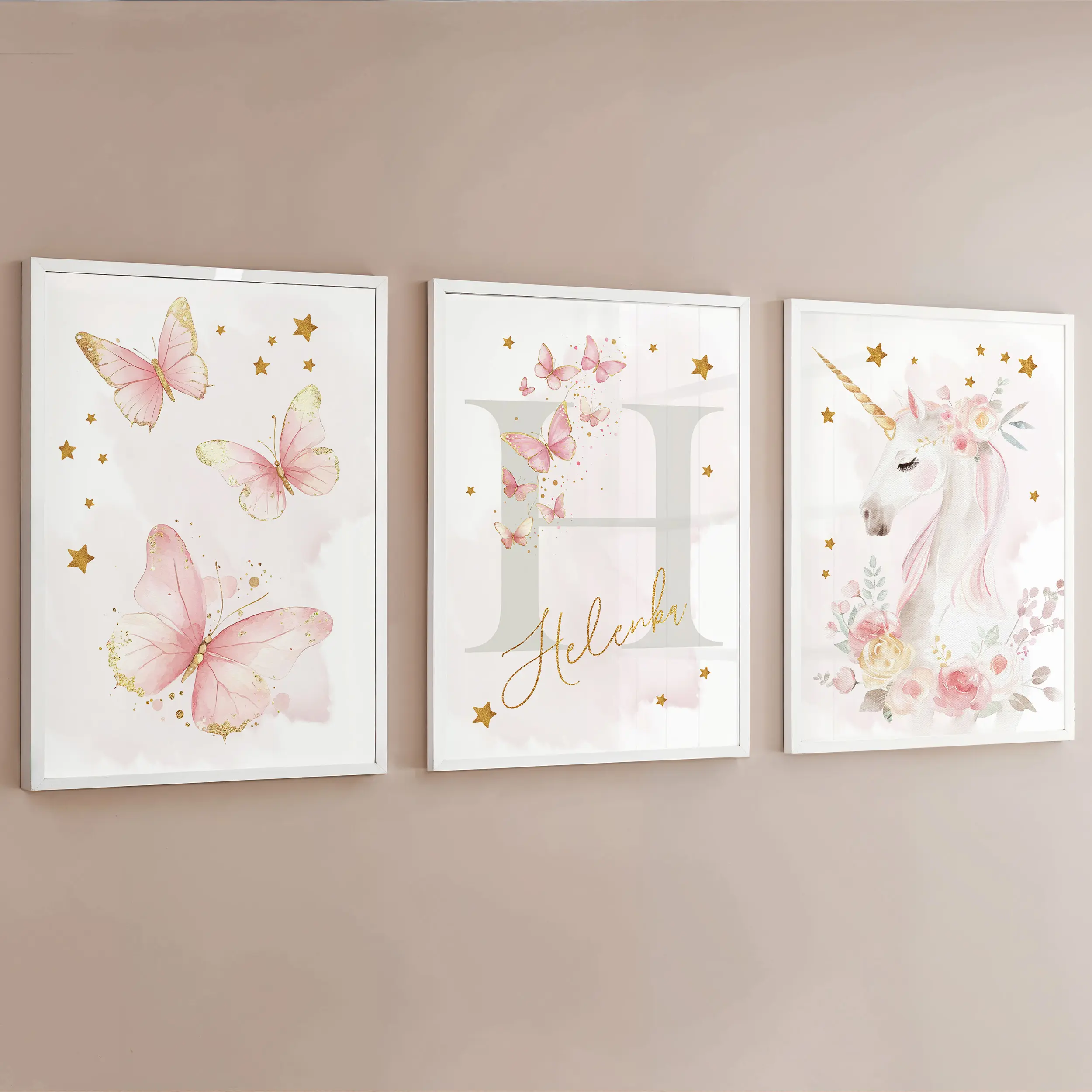 Zestaw 3 plakatów z jednorożcem i motylami, który od razu robi efekt “wow” na ścianie. Idealny do pokoju dziewczynki i na prezent.