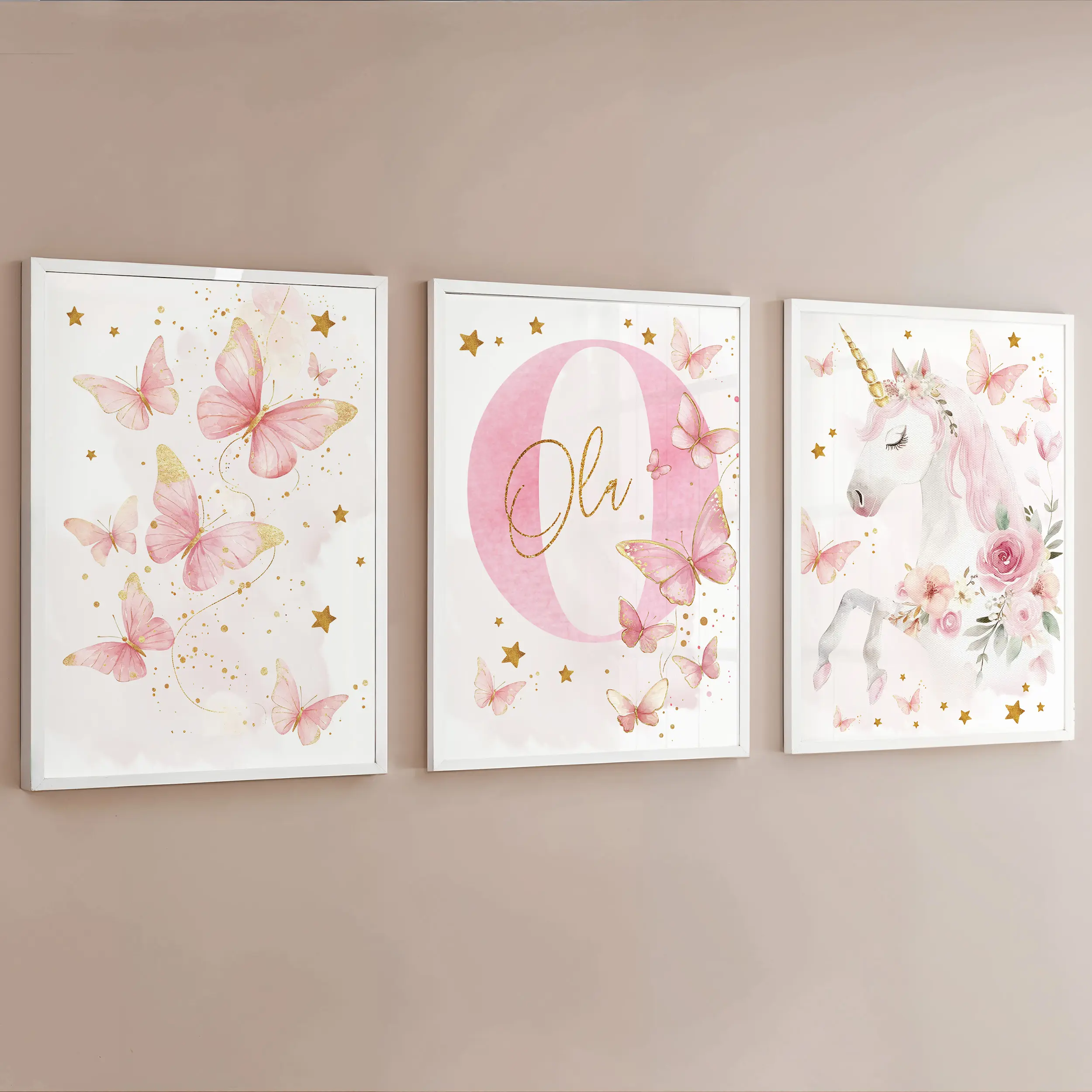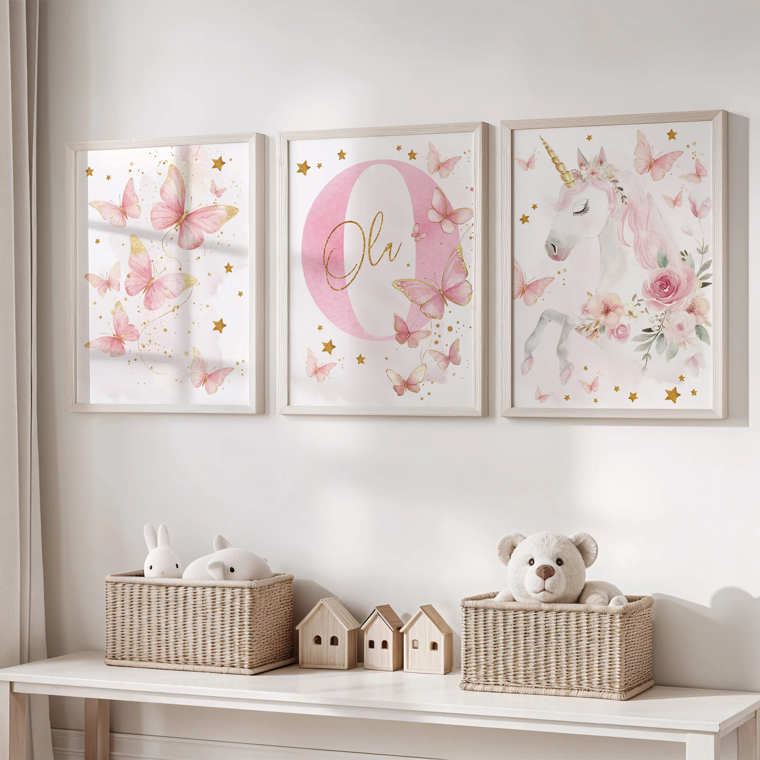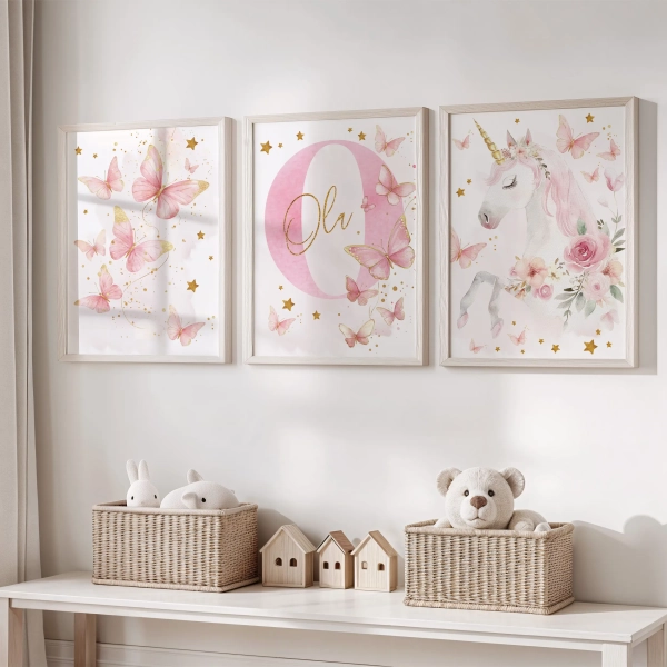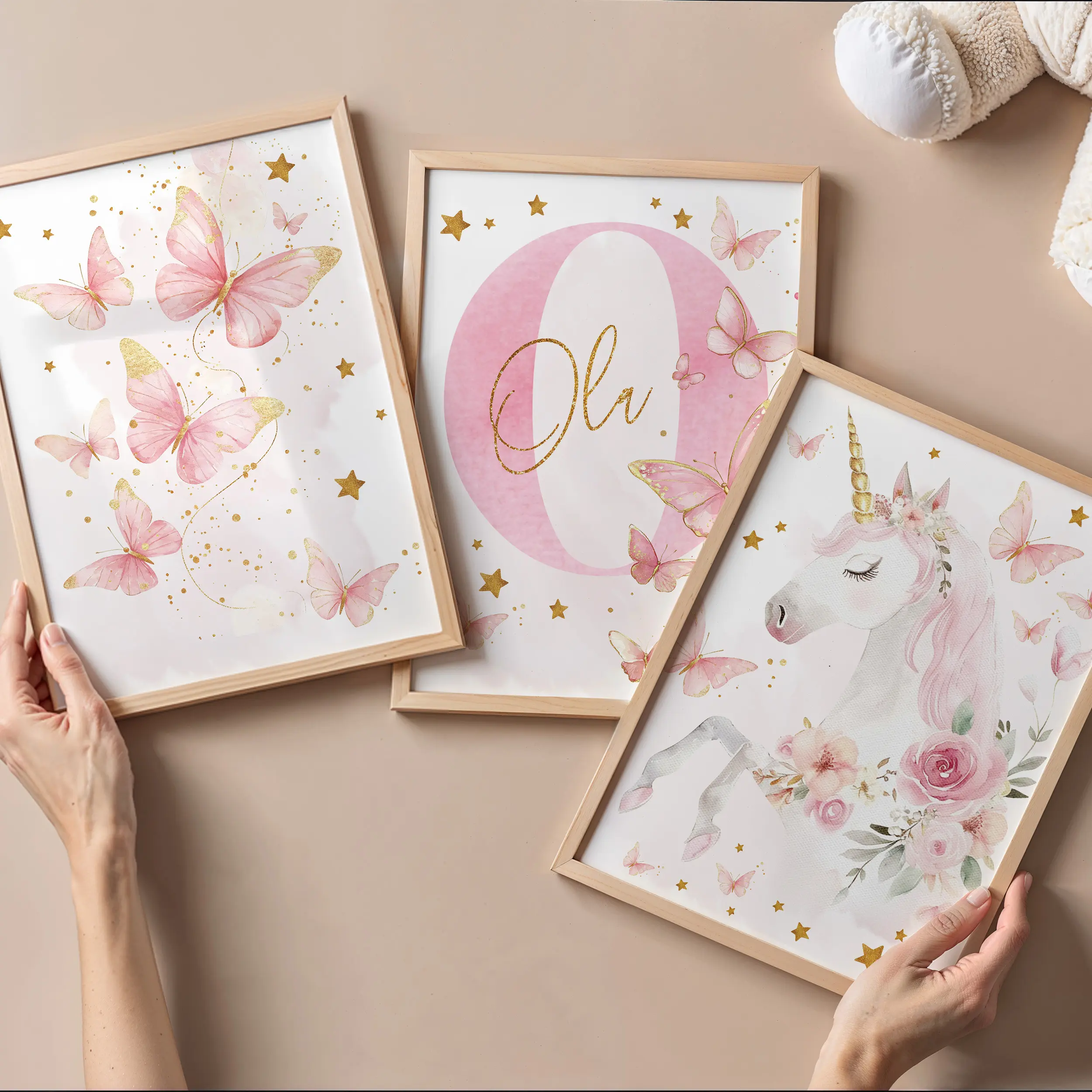 Ten zestaw plakatów łączy jednorożca, motyle oraz inicjał dziecka w jednej, spójnej kompozycji. Pastelowe kolory i delikatne detale sprawiają, że dekoracja dobrze pasuje do pokoju dziewczynki i łatwo dopasowuje się do różnych aranżacji.