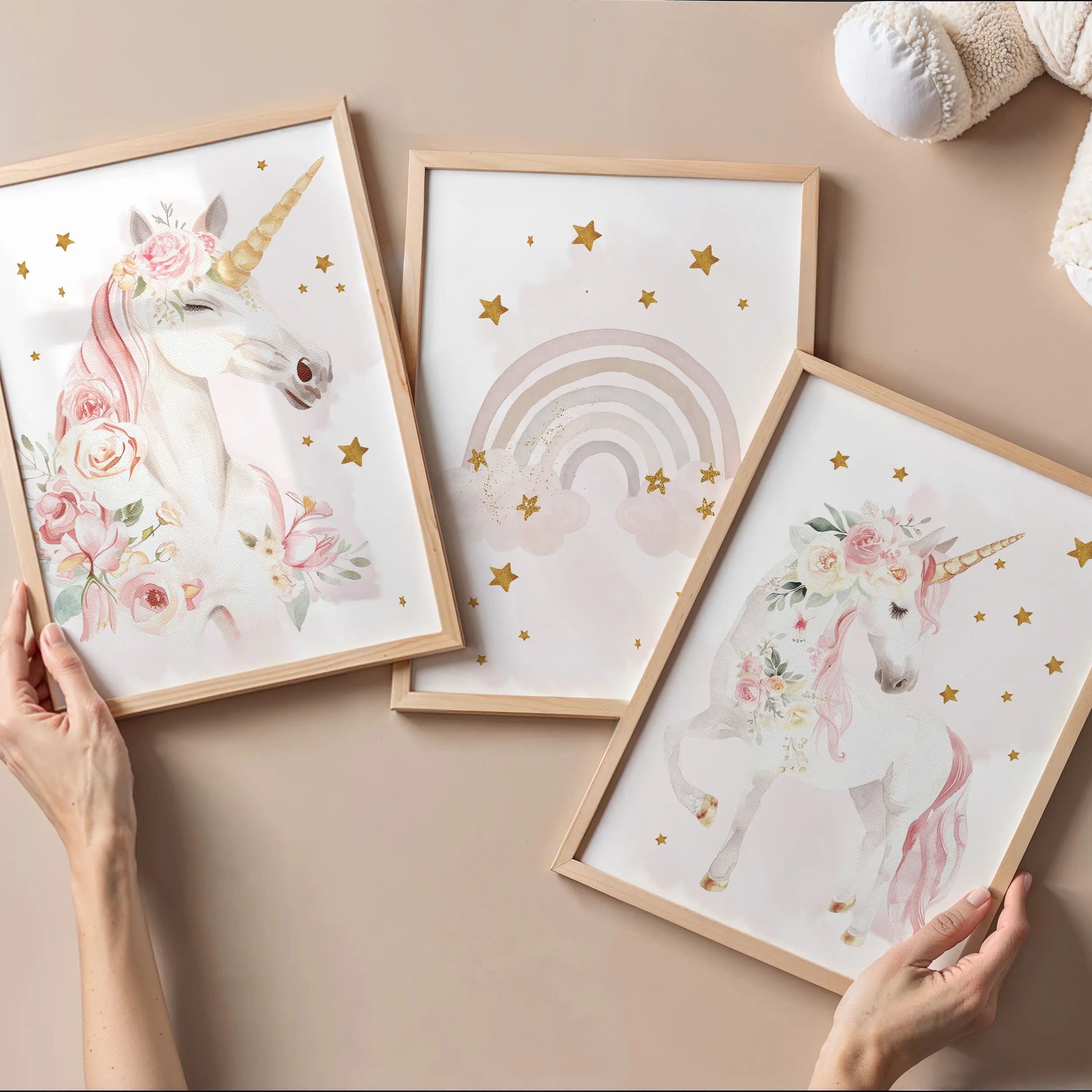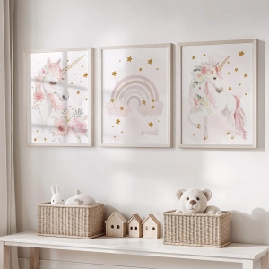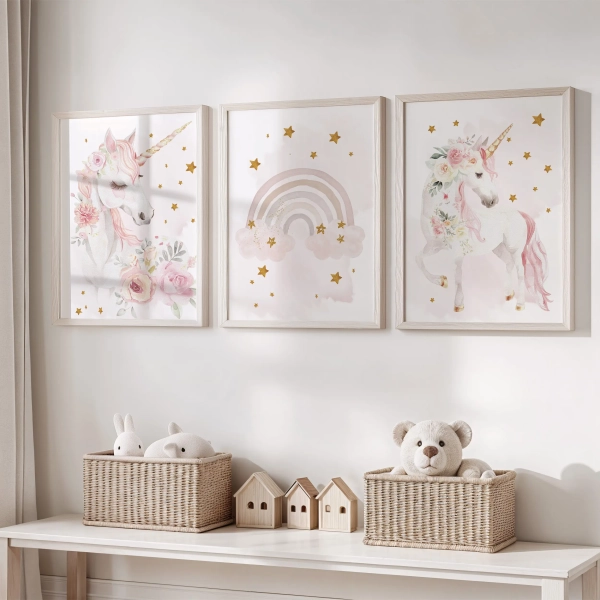 Każda dziewczynka ma swój mały, magiczny świat. Czasem pojawia się w nim jednorożec, czasem tęcza, a czasem jedno i drugie. Ten zestaw plakatów powstał po to, aby stworzyć w dziecięcym pokoju spokojną, jasną przestrzeń pełną marzeń i pastelowych detali.